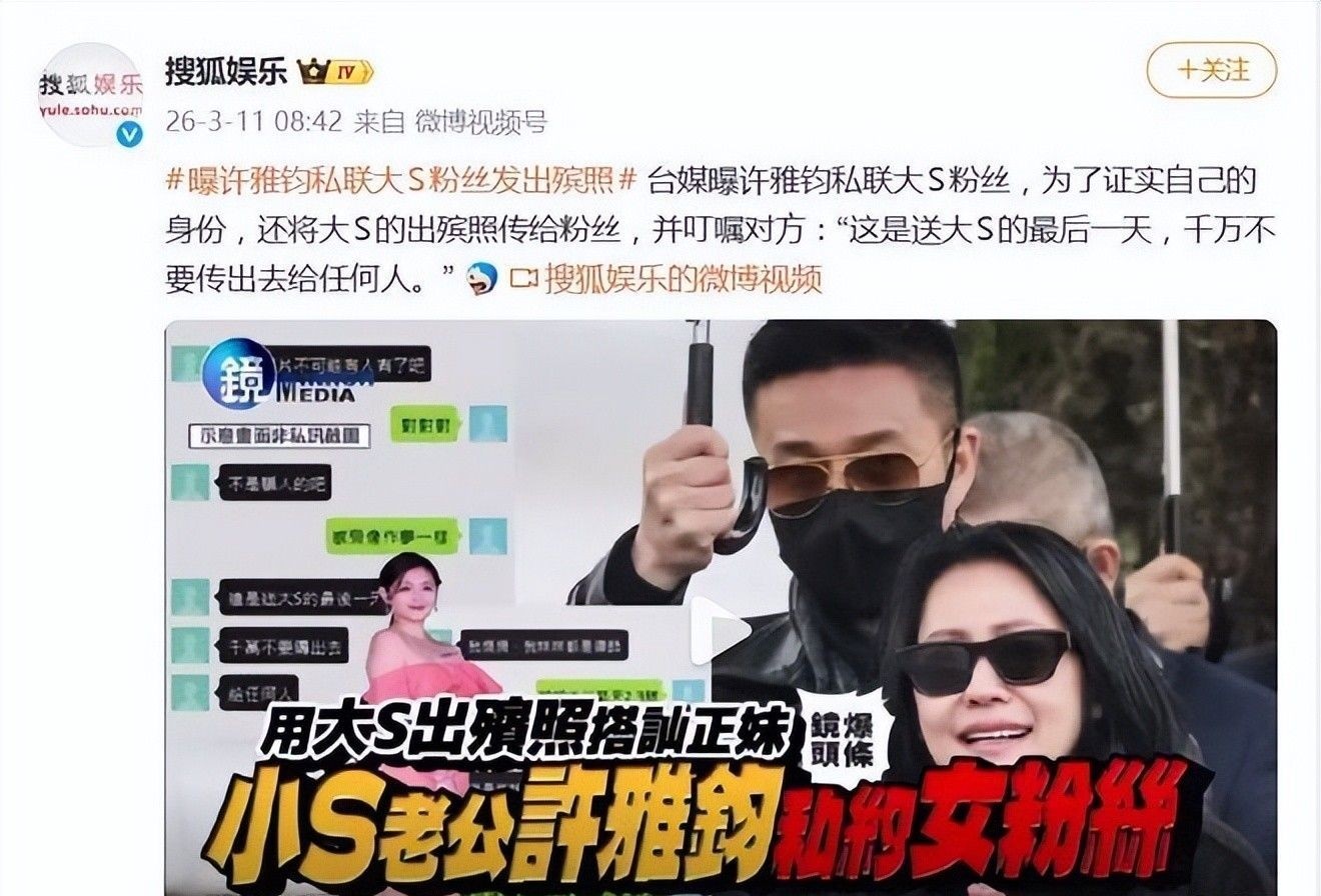 他起初以“感谢你长久以来支持大S和徐氏家族”为由开启对话,可聊至中途,对方因察觉语气异常产生疑虑,怀疑其身份真实性。面对质疑,许雅钧竟直接抛出一张极具敏感性的照片——大S出殡仪式的内部影像。